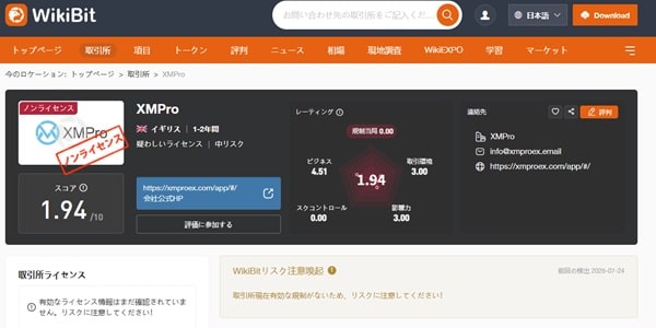 金融業者の情報を網羅的に収集しているWikiFXでは、XMProを「ノンライセンス」と明確に判定しています。